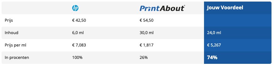 Bekijk in de tabel een voorbeeldbesparing met de HP 301 Multipack en ontdek hoeveel je kunt besparen met ons huismerk. Wil je weten hoeveel jij kunt besparen? Vergelijk eenvoudig jouw (toner)cartridges met onze keuzehulp!